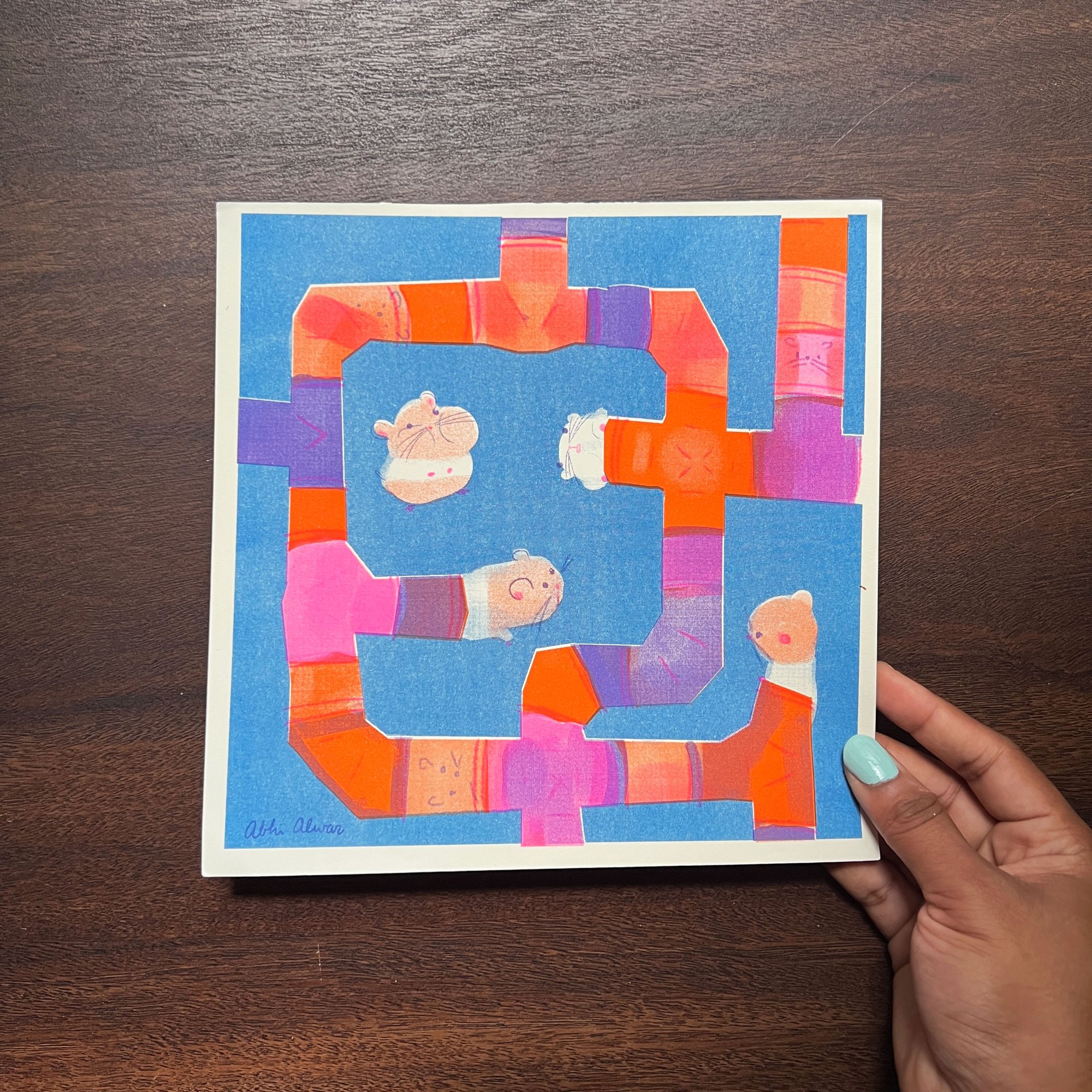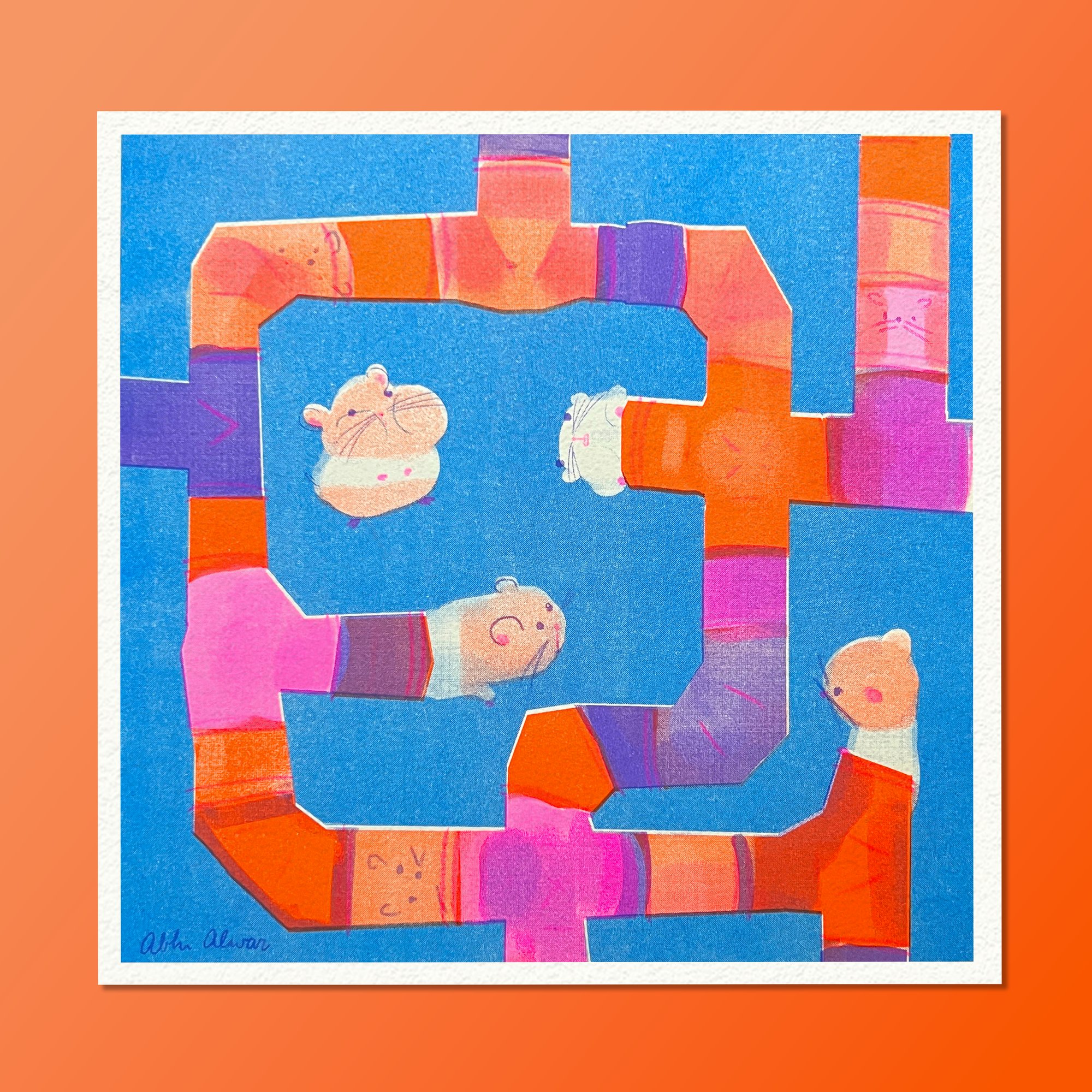 8.5" x 8.5", 3 color (orange, fluorescent pink, and blue) riso print.