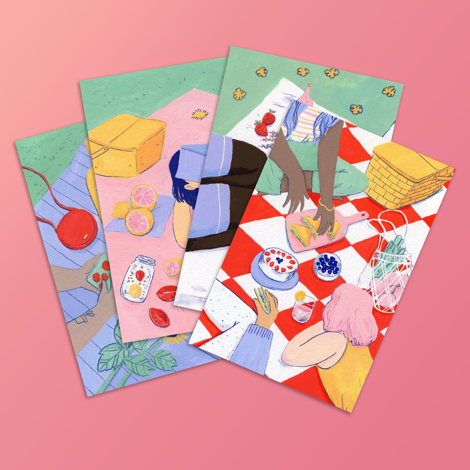Invite your friends to a picnic with this set of 4 postcards (4"x6") that feature printed illustrations originally done in gouache. The backs of the cards have blank space for your message and lines for an address and a stamp.